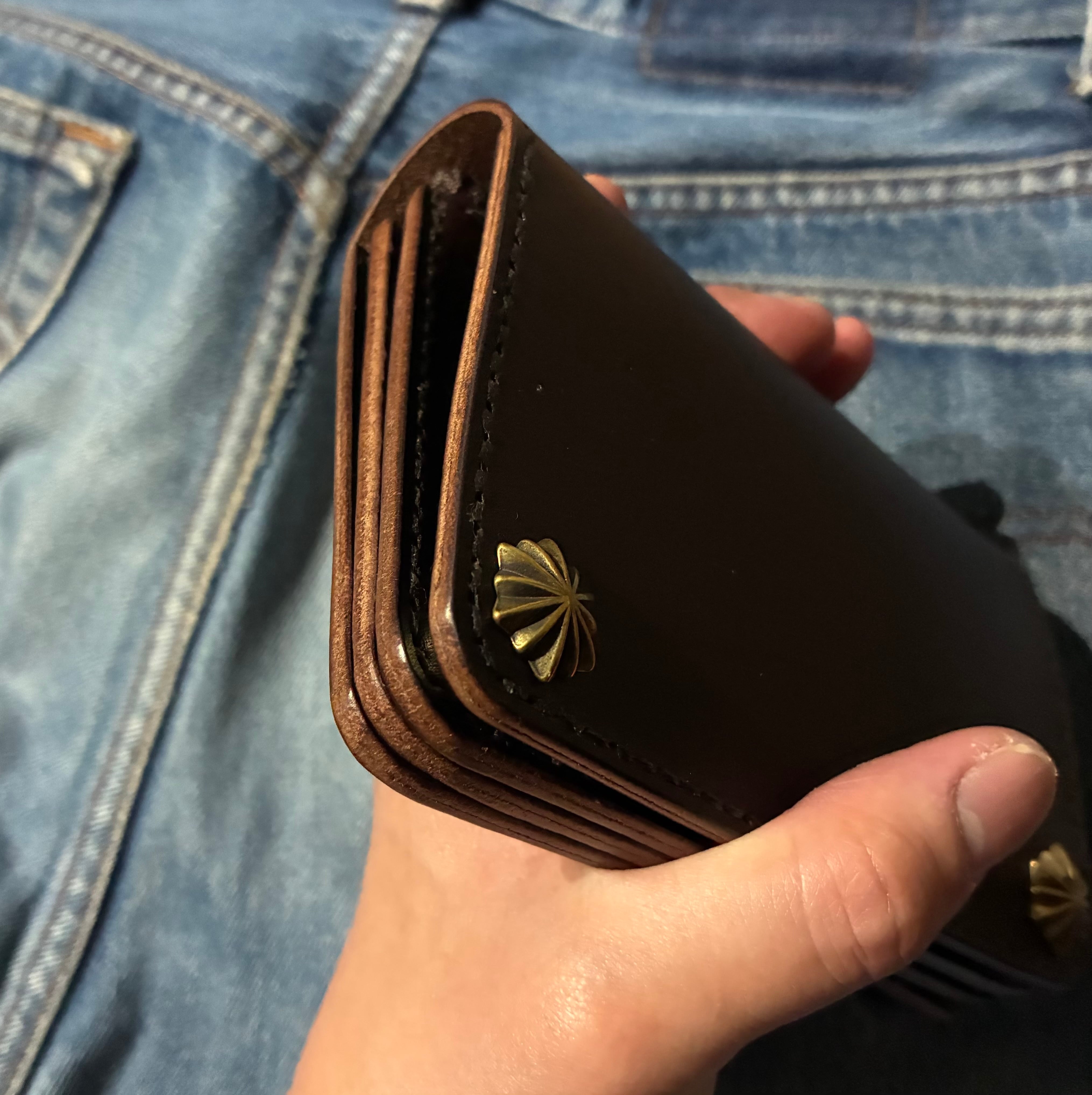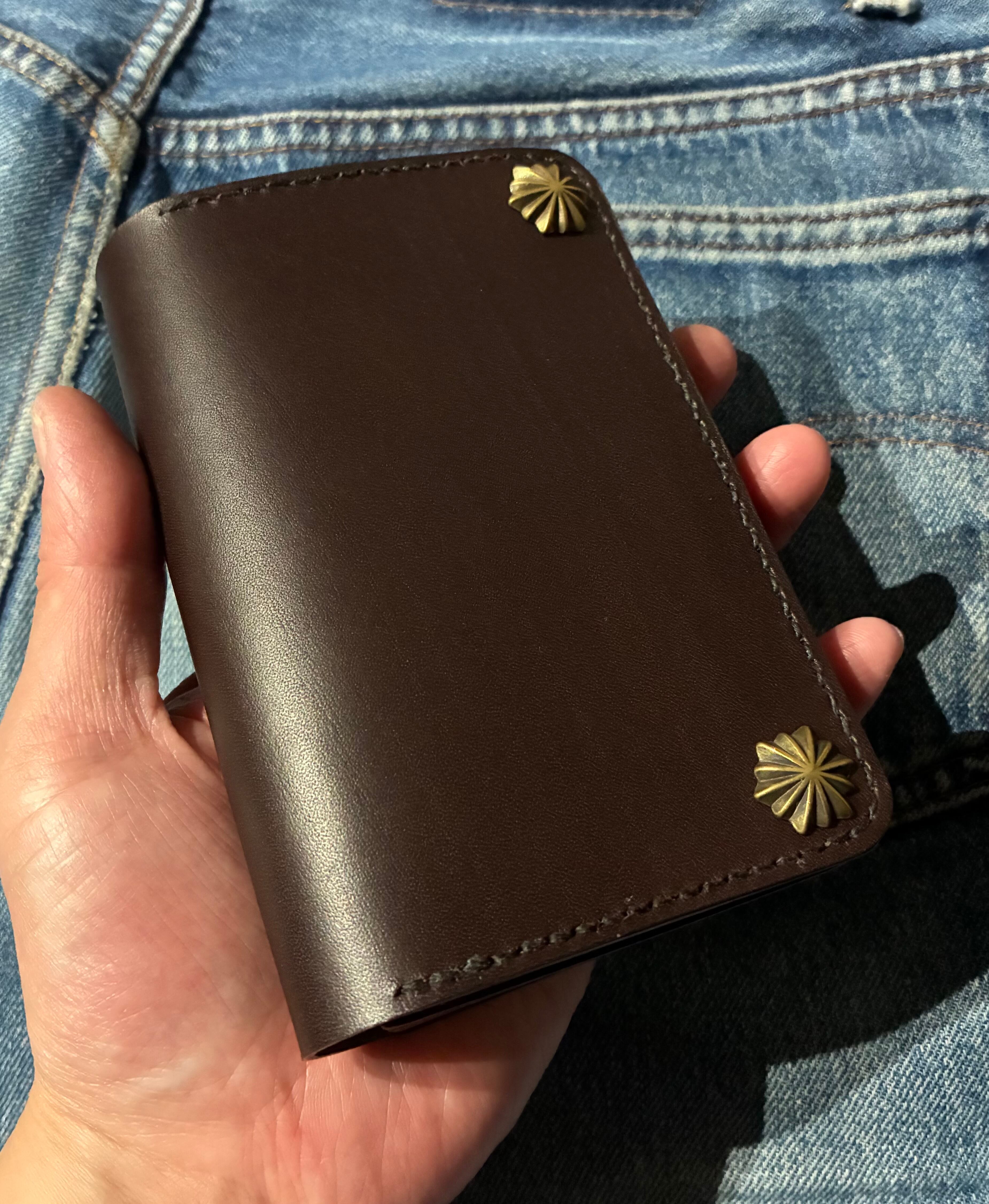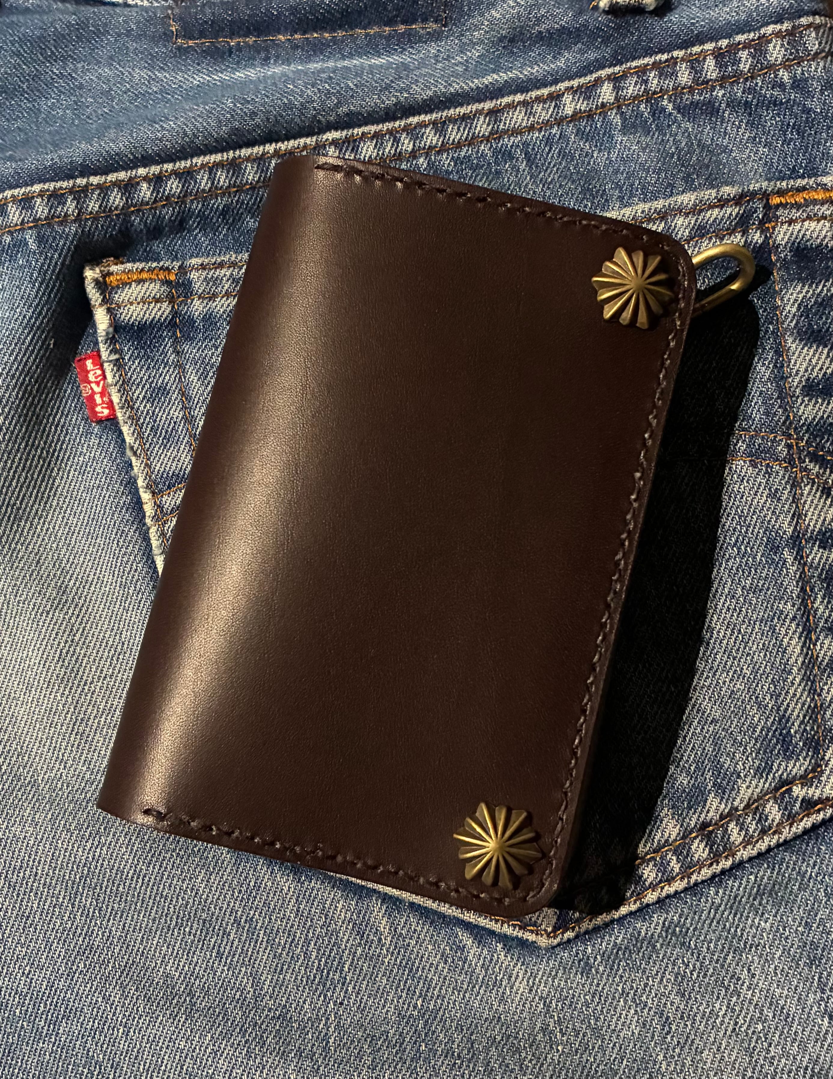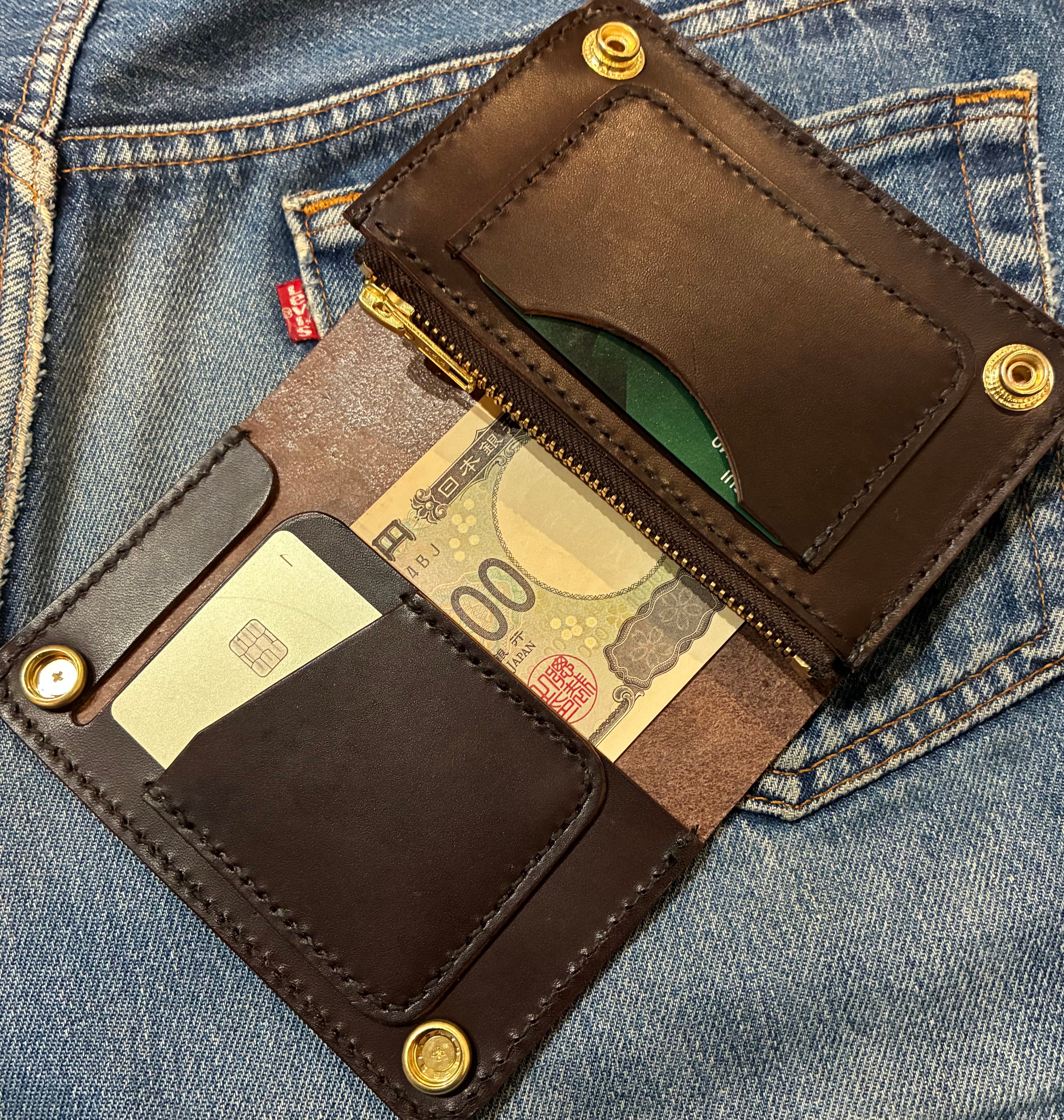 イタリアンレザー、ブルガロを使用した3層構造のミドルトラッカーウォレット。