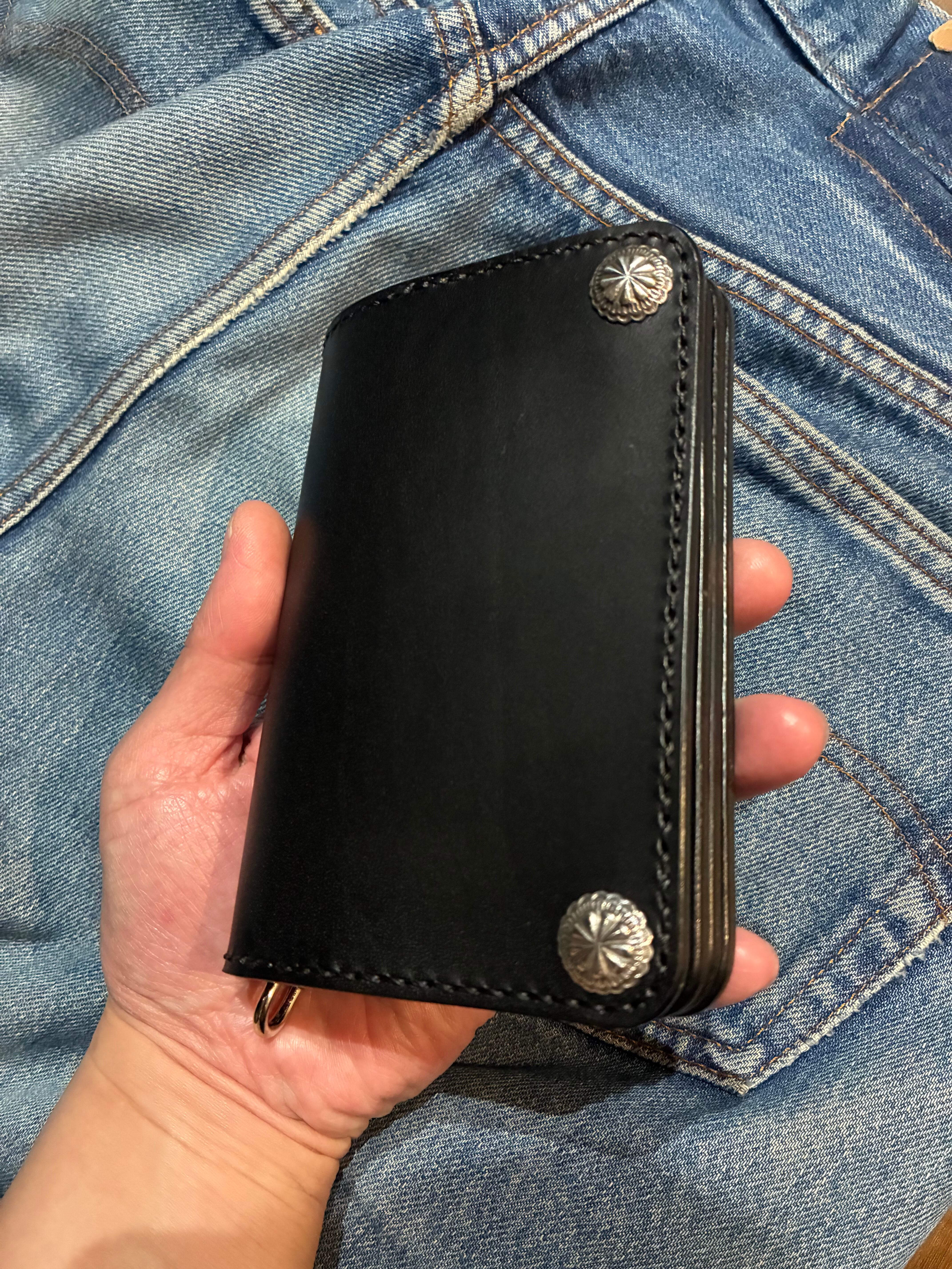 イタリアンレザー、ブルガロを使用した3層構造のミドルトラッカーウォレット。