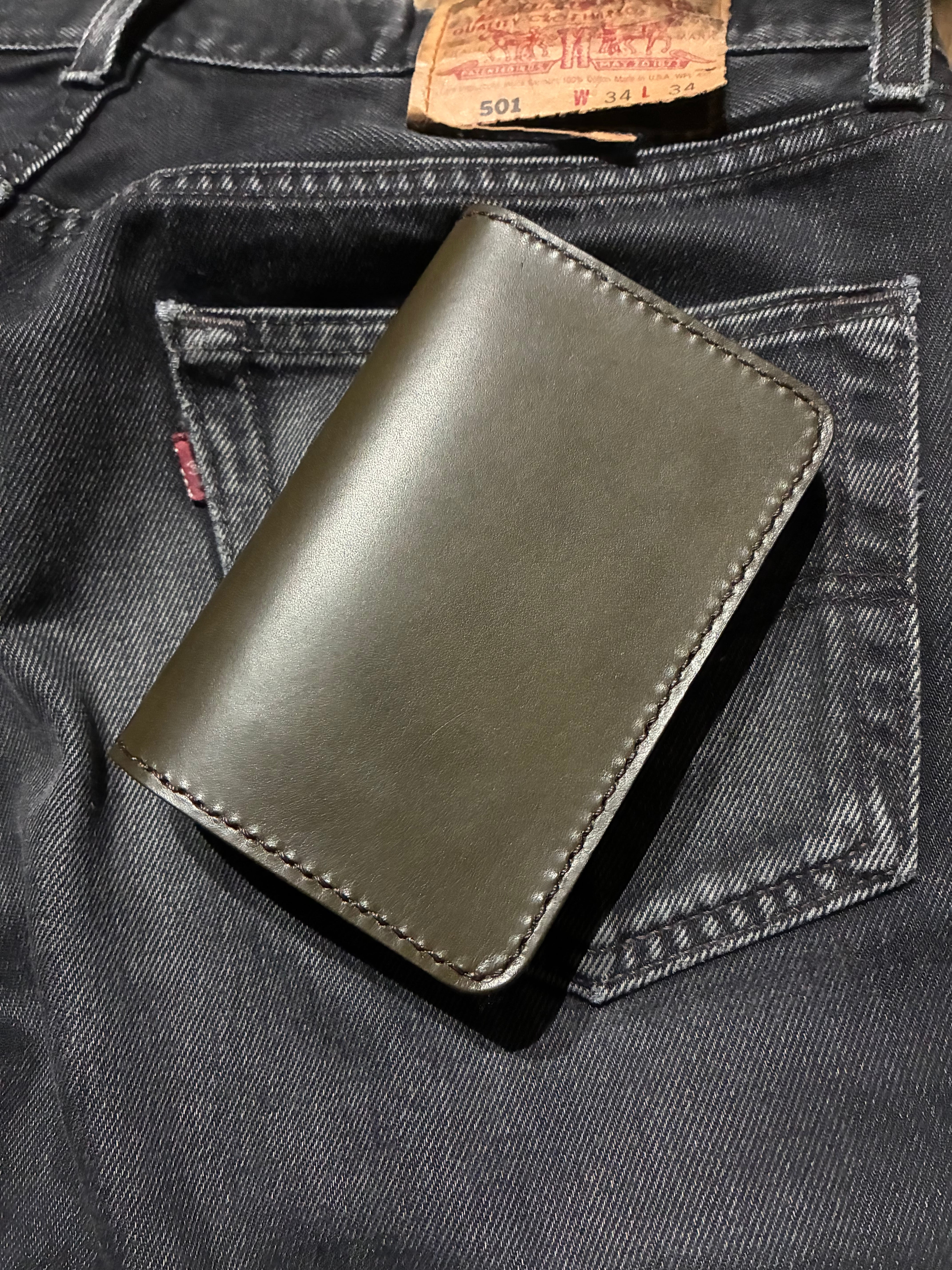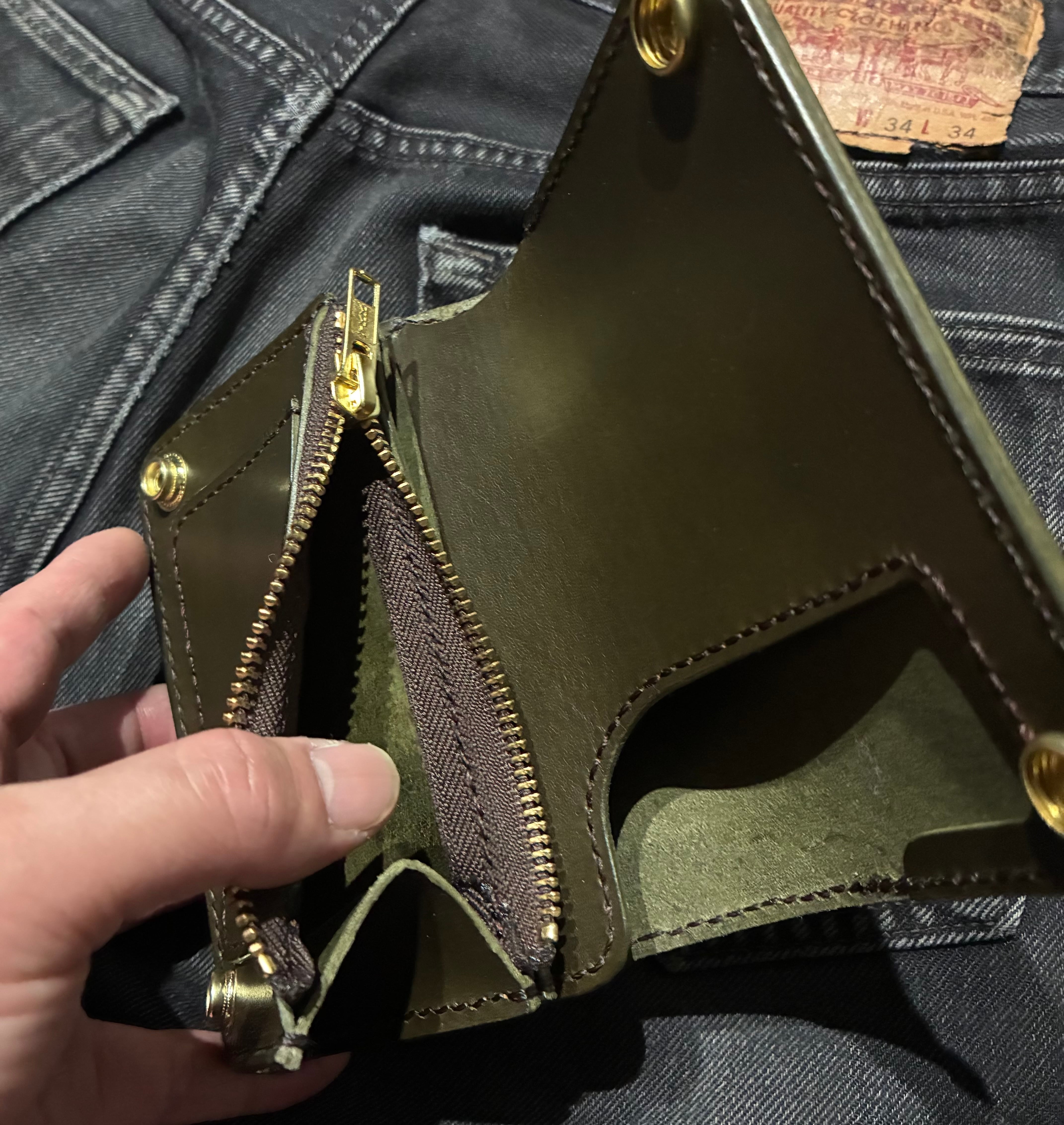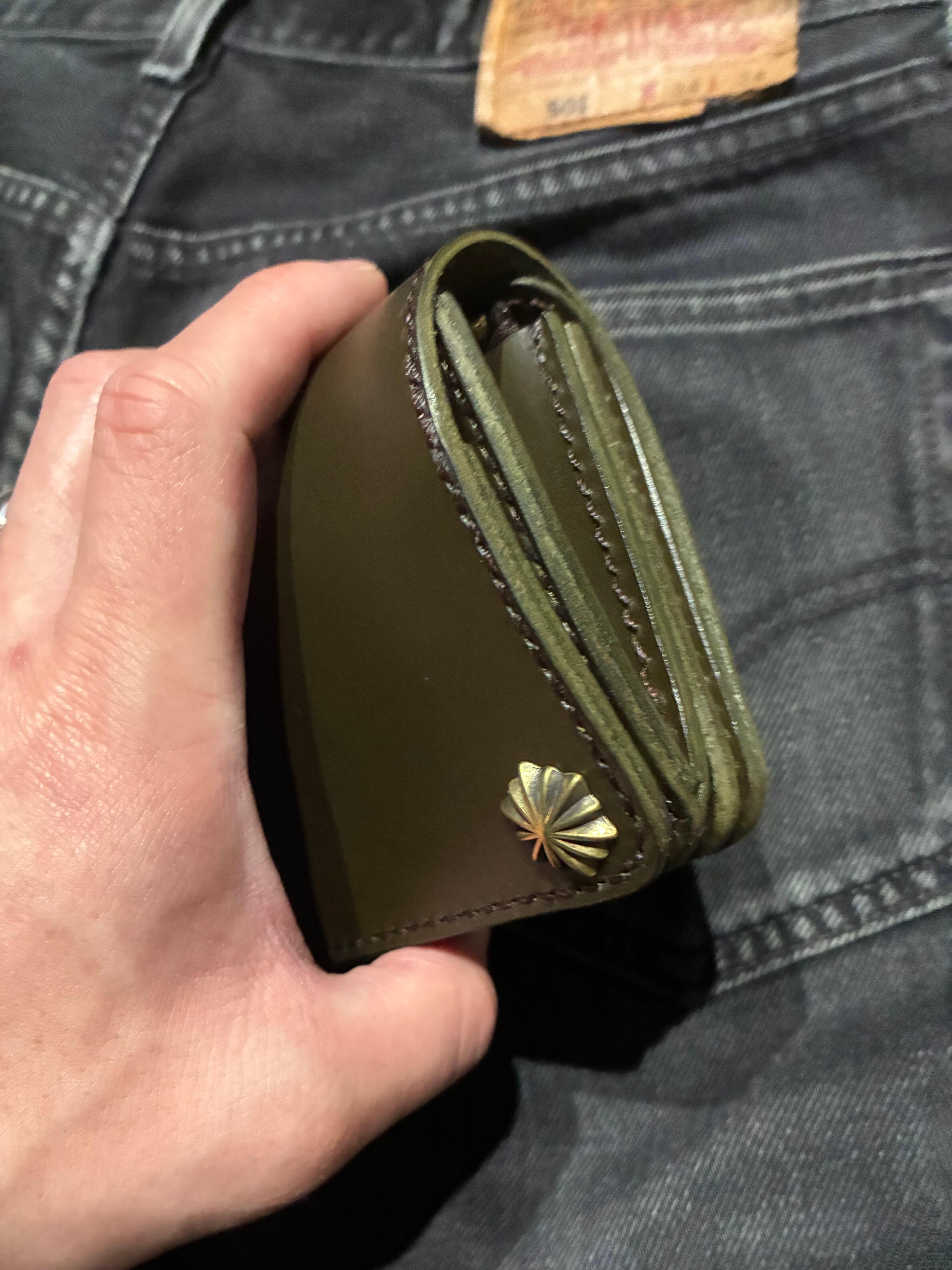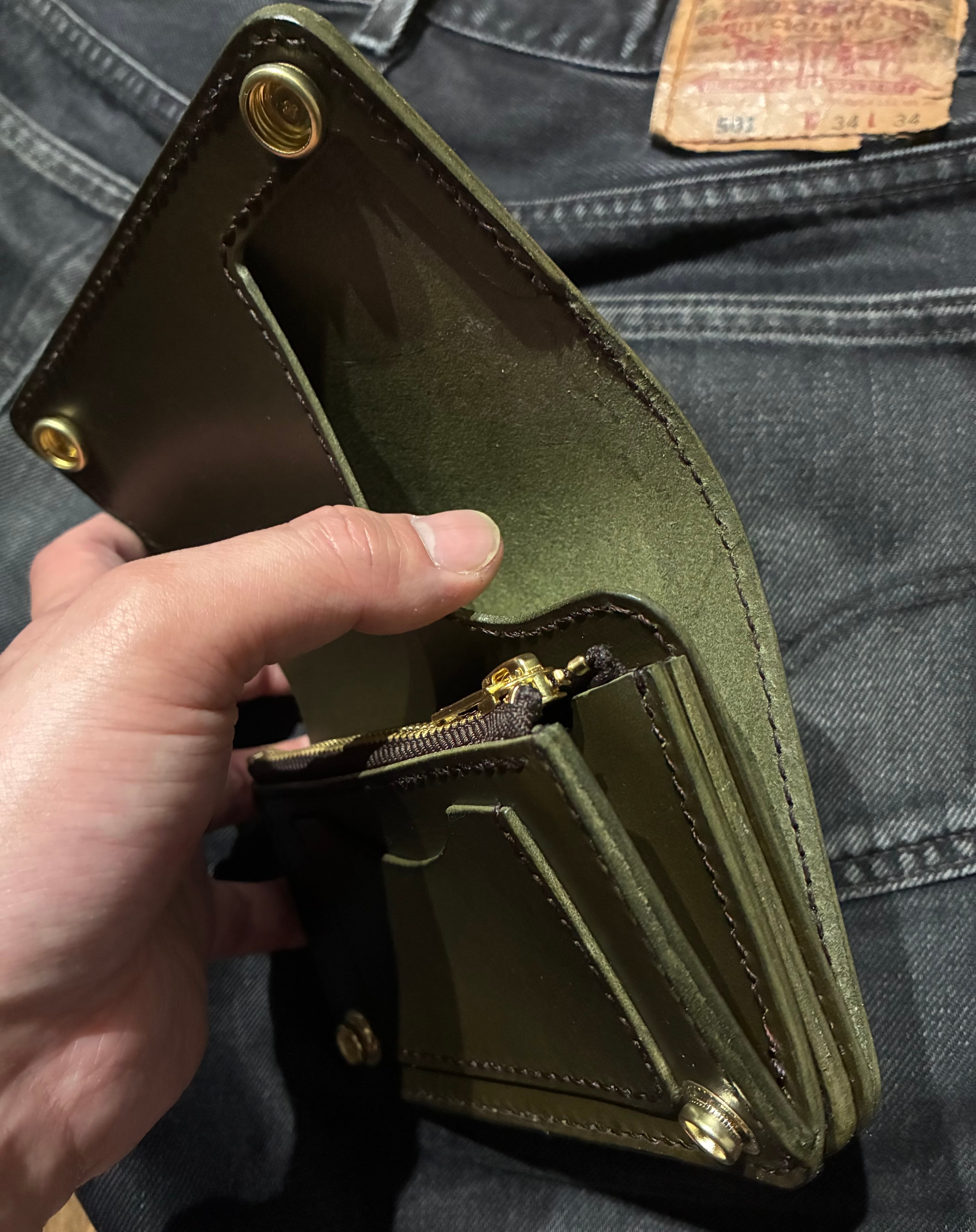 イタリアンレザー、ブルガロを使用した3層構造のミドルトラッカーウォレット。